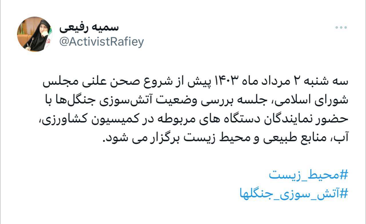 به گزارش نمایندگان، سمیه رفیعی سخنگوی کمیسیون کشاورزی مجلس در صفحه شخصی خود در شبکه ایکس اعلام کرد: سه شنبه ۲ مرداد ماه ۱۴۰۳ پیش از شروع صحن علنی مجلس شورای اسلامی، جلسه بررسی وضعیت آتشسوزی جنگلها با حضور نمایندگان دستگاه های مربوطه در کمیسیون کشاورزی، آب، منابع طبیعی و محیط زیست برگزار می شود.