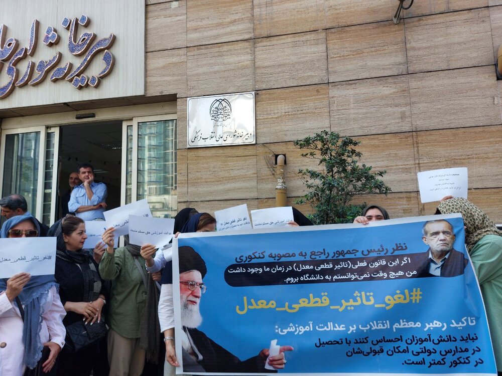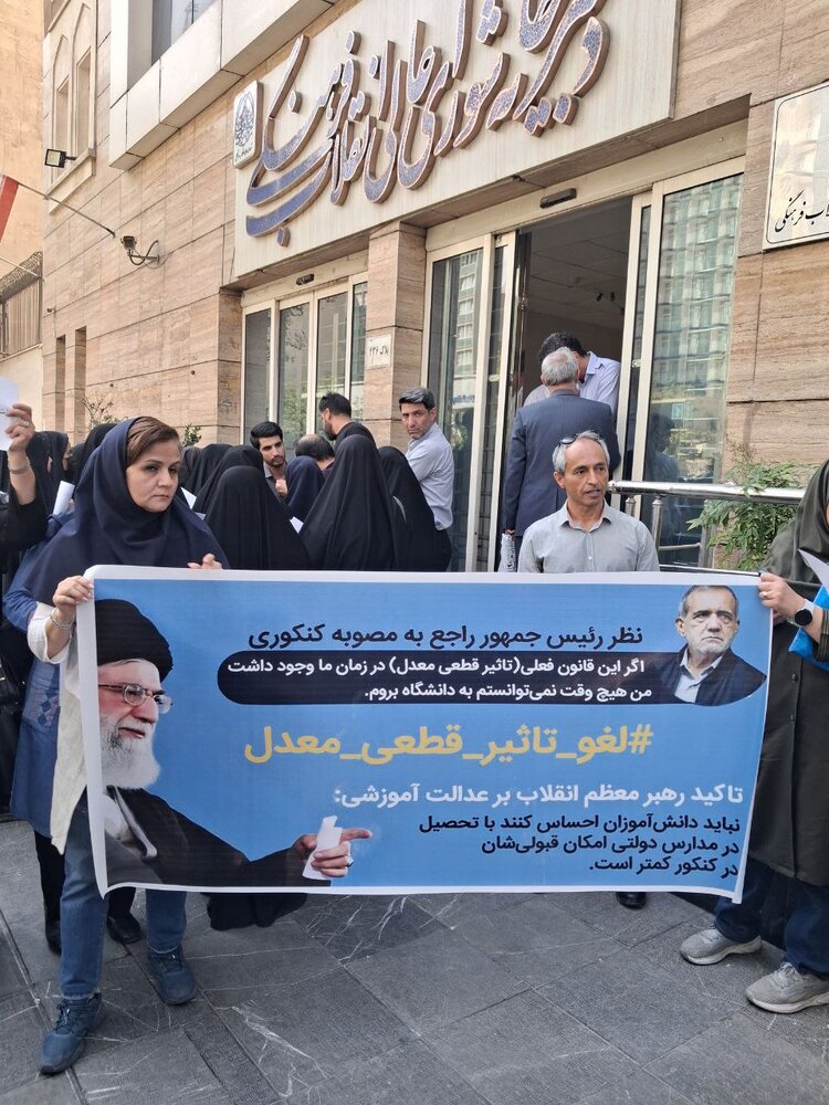 اولیا دانش آموزان کنکوری در اعتراض به تاثیر معدل در کنکور، امروز ۱۵ شهریور ۱۴۰۴ جلوی دبیرخانه شورای عالی انقلاب فرهنگی حضور پیدا کردند.